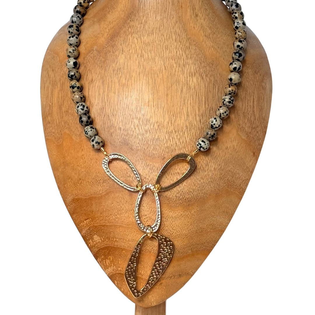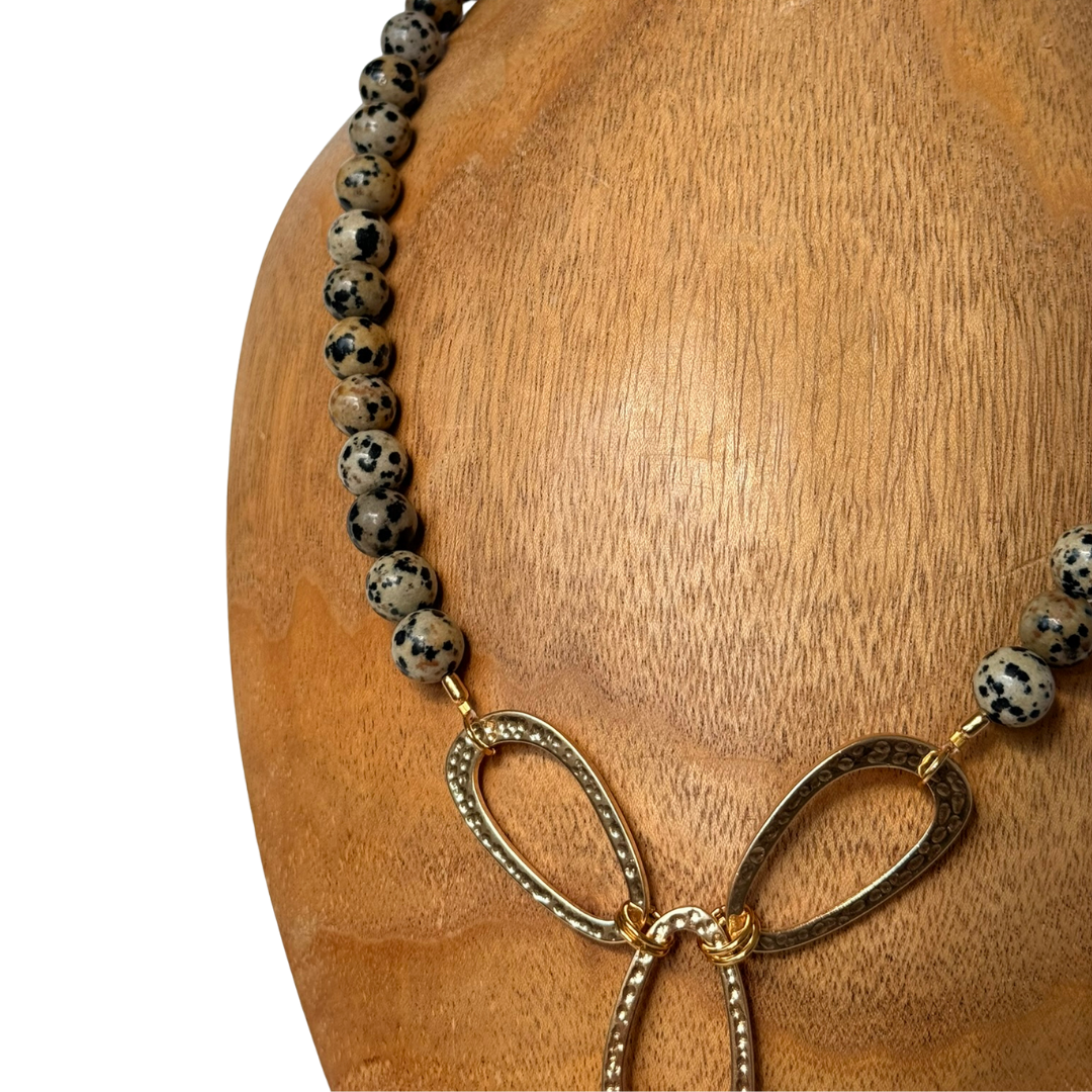 El Collar Milena está elaborado con piedras naturales dalmatitas, reconocibles por su patrón moteado único, que aporta un estilo orgánico y contemporáneo. El diseño se completa con dijes grandes acabados en zamak, que añaden volumen, brillo artesanal y un punto focal lleno de carácter.